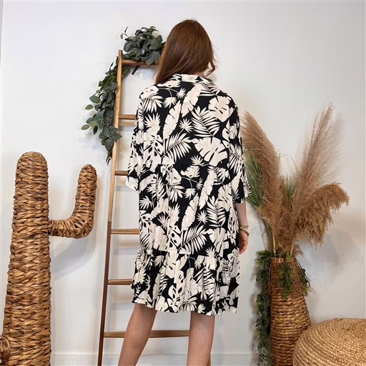Exotique, cette robe légère en viscose avec son col V. Coupe trapèze boutonnée au niveau du décoleté, col chemisier, manches 3/4. Bel imprimé lumineux feuillage. Elle s’adaptera à toutes les occasions, sortie à la plage, diner en terrasse avec des sandales et une pochette.