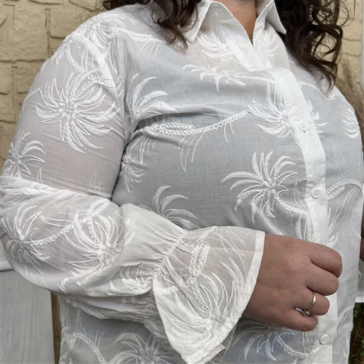 Légère, élégante et subtilement travaillée, cette chemise blanche brodée apporte une touche de fraîcheur et de raffinement à toutes vos tenues. Son motif palmiers ton sur ton lui donne du caractère tout en restant facile à porter au quotidien. Une pièce idéale pour un look chic décontracté, en toute saison.
