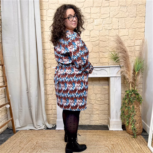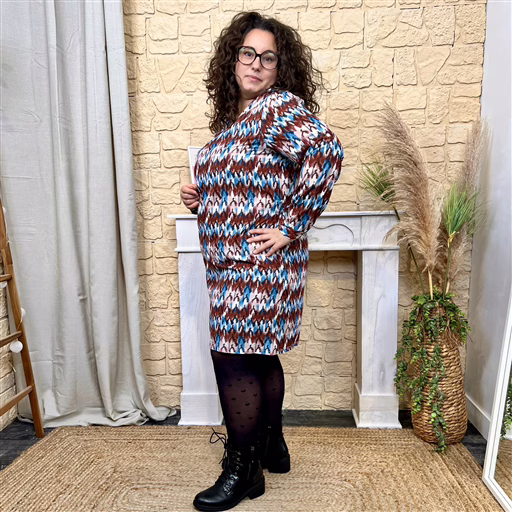 Cette robe se distingue par son imprimé en zig-zag. Son motif apporte du caractère, sa coupe droite légèrement évasée assure un tombé confortable. Le col en V met délicatement le décolleté en valeur, tandis que les manches longues apportent une touche d’élégance et de praticité pour la saison.