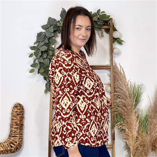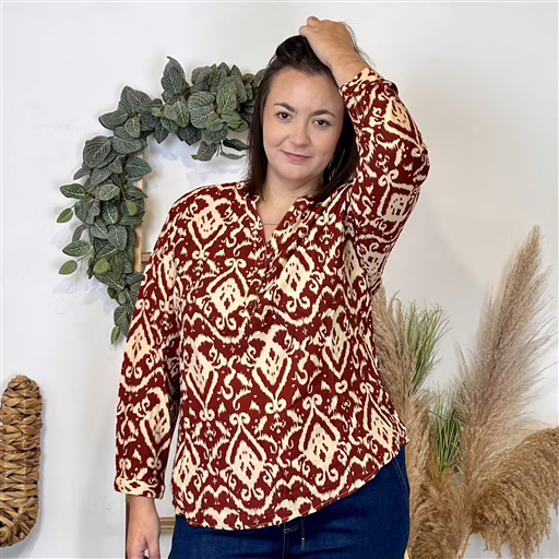 Blouse fluide à imprimé baroque, au style élégant et affirmé. Sa coupe droite assure un porté confortable, tandis que l’encolure en V boutonnée apporte une touche féminine. La matière légère et agréable en fait une pièce idéale à porter au quotidien.