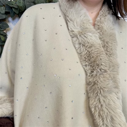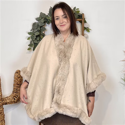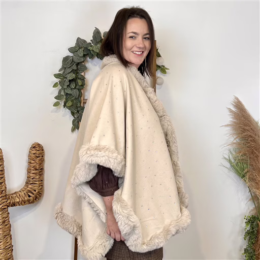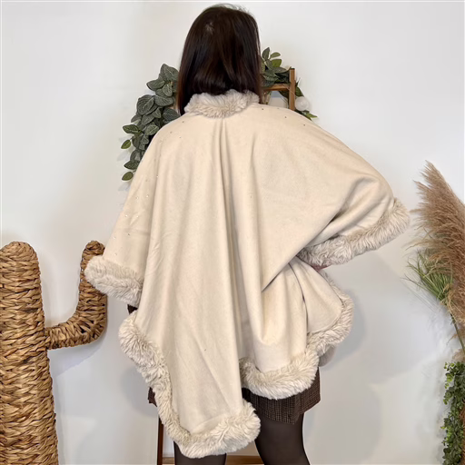 Cape douce, parfaite pour la saison froide. Sa matière façon lainage offre une jolie tenue tout en restant confortable, et elle est parsemée de petits strass qui apportent une touche lumineuse. Ses finitions en fausse fourrure tout autour de l’ouverture donnent un effet cocooning très chic. Sa coupe ample type poncho permet de la porter facilement sur un pull ou une veste légère, sans gêner les mouvements.