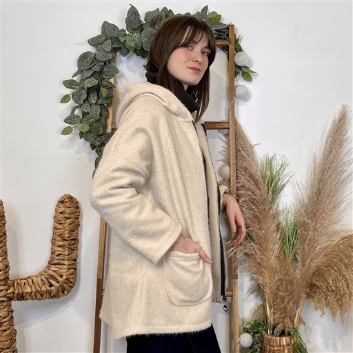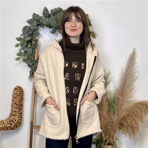 Découvrez ce manteau cocooning au style casual chic, parfait pour affronter la saison avec douceur. Sa matière effet laine/feutrée, moelleuse et chaude, donne tout de suite une allure cosy et réconfortante. On adore sa couleur écru lumineuse qui s’accorde facilement avec toute la garde-robe. Sa coupe droite et légèrement oversize assure un tombé fluide et confortable. La capuche ajoute une note décontractée et pratique pour les jours frais, tandis que la fermeture zippée permet de le porter ouvert ou fermé selon vos envies. Les grandes poches plaquées à l’avant renforcent son côté pratique et accentuent le look détente sophistiqué.