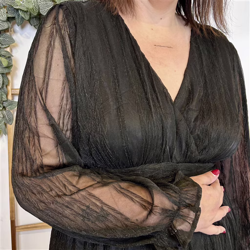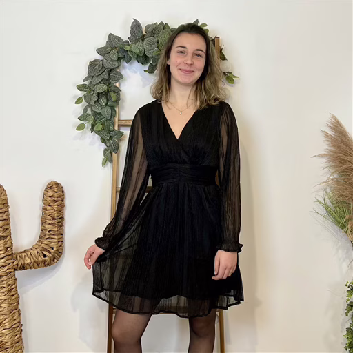 Robe courte noire au style élégant et féminin, parfaite pour les occasions comme pour une tenue chic du quotidien. Confectionnée dans une matière légère et légèrement texturée, elle joue sur la transparence des manches longues. Son décolleté en V met joliment en valeur le buste. La taille est marquée par une large ceinture froncée qui affine la silhouette. La jupe évasée apporte du mouvement avec un tombé fluide qui reste confortable à porter. Les poignets sont resserrés pour une finition délicate et un léger effet bouffant des manches.