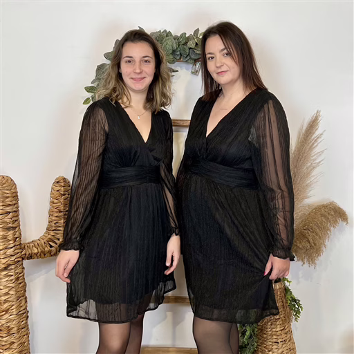 Robe courte noire au style élégant et féminin, parfaite pour les occasions comme pour une tenue chic du quotidien. Confectionnée dans une matière légère et légèrement texturée, elle joue sur la transparence des manches longues.