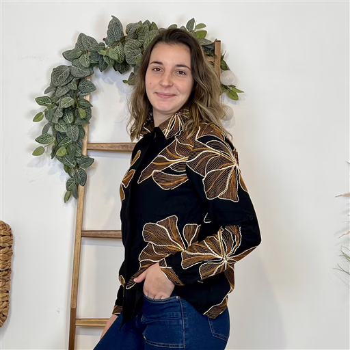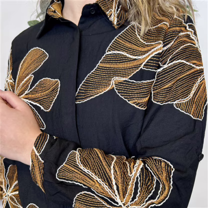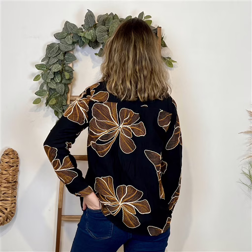 Blouse fluide à fond noir, au style à la fois chic et facile à porter. Elle se distingue par son imprimé graphique et feuillage dans des tons ocre, caramel et blanc, qui habille le devant, les épaules et les manches.