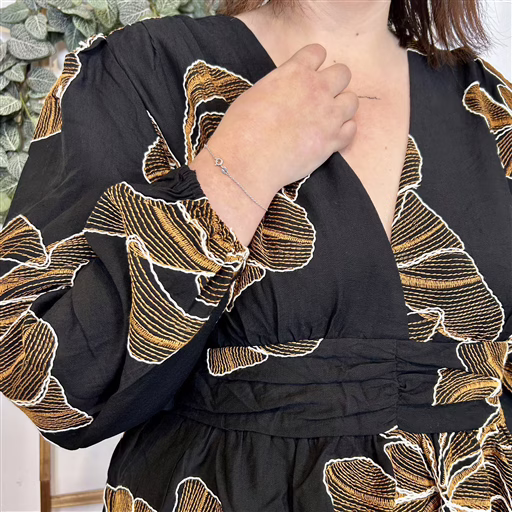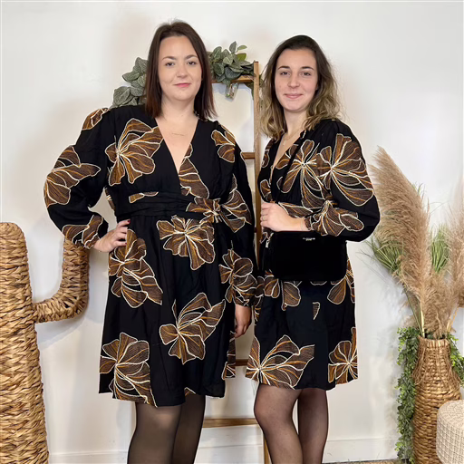 Robe courte noire « Maëlle » avec un imprimé floral graphique. Le haut présente un décolleté en V qui met en valeur le buste, et une taille marquée par une ceinture à nouer. Les manches longues légèrement amples ajoutent une touche raffinée. La jupe évasée offre un joli mouvement, parfait pour le quotidien comme pour une sortie.