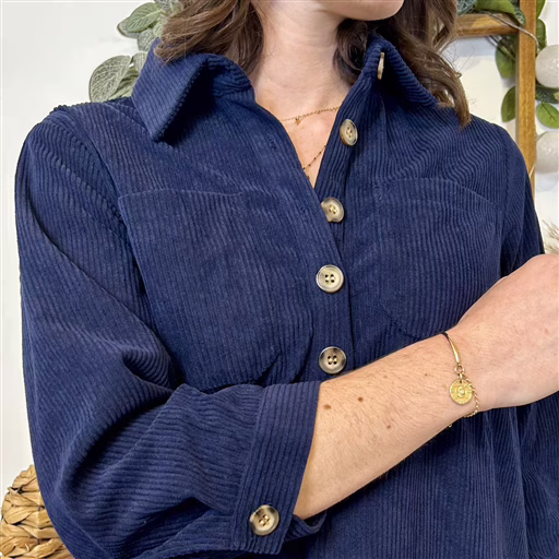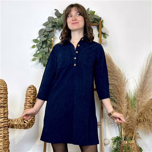 Cette robe courte en velours côtelé bleu marine est une pièce simple et chic, parfaite pour la saison. Avec sa coupe trapèze fluide, elle tombe joliment sur la silhouette et offre un confort idéal au quotidien.