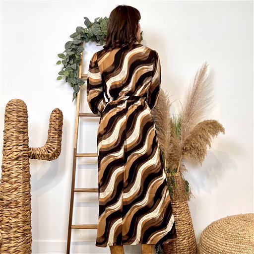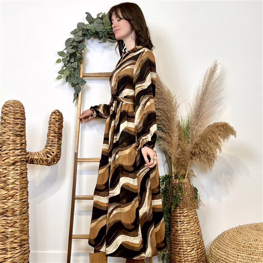 Portez-la avec des bottines camel ou noires pour un look 70’s très actuel, ou ajoutez une ceinture pour souligner encore plus la taille. Un manteau long uni et quelques bijoux dorés feront parfaitement ressortir l’imprimé.