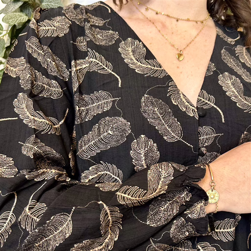 Chic et pleine de caractère, cette robe chemise noire se distingue par son imprimé plumes dorées au style délicatement bohème. Sur fond noir profond, les motifs lumineux apportent une touche raffinée et originale, parfaite pour la saison.