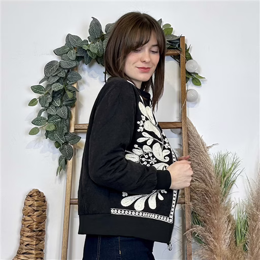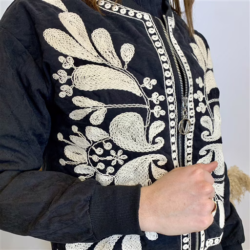 Veste matelassée bordée au style bohème chic, parfaite pour réchauffer une tenue avec caractère. On adore ses broderies contrastées esprit floral sur le devant et les finitions travaillées le long de la fermeture, qui lui donnent une allure raffinée et originale.