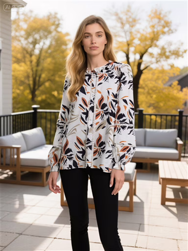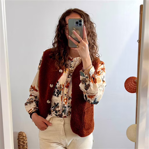 Les détails font toute la différence : une patte de boutonnage ornée de galons ajourés apporte une touche artisanale, tandis que les manches longues sont soulignées de bandes décoratives pour un effet subtil et raffiné. Le col légèrement montant avec une ouverture en V met joliment le port de tête.
