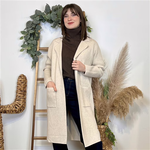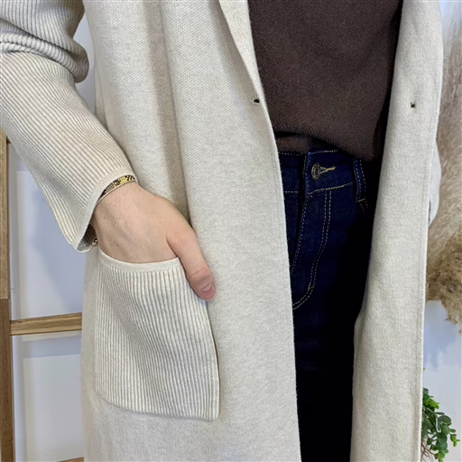 La maille est souple et agréable, parfaite pour la mi-saison ou en superposition l’hiver. Les grandes poches plaquées ajoutent un côté pratique et décontracté, tout en structurant joliment la pièce.