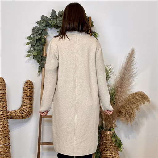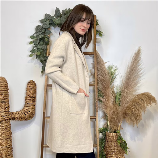 Manteau en maille douce proposé en taille unique, idéal pour un look élégant et confortable. Sa coupe longue et droite allonge la silhouette, tout en restant facile à porter au quotidien. On aime son col tailleur qui apporte une touche chic, ainsi que sa fermeture discrète sur le devant.