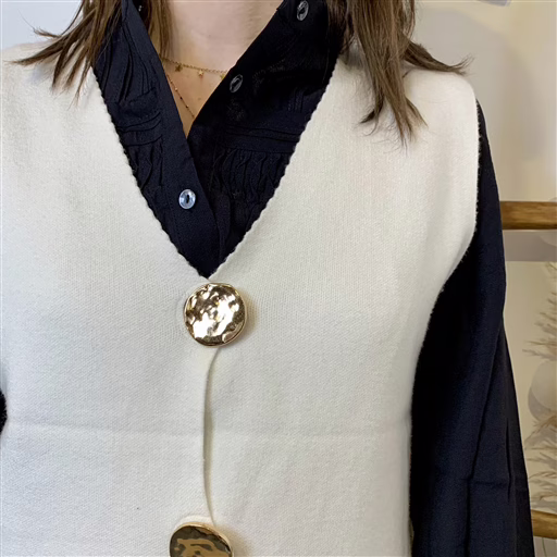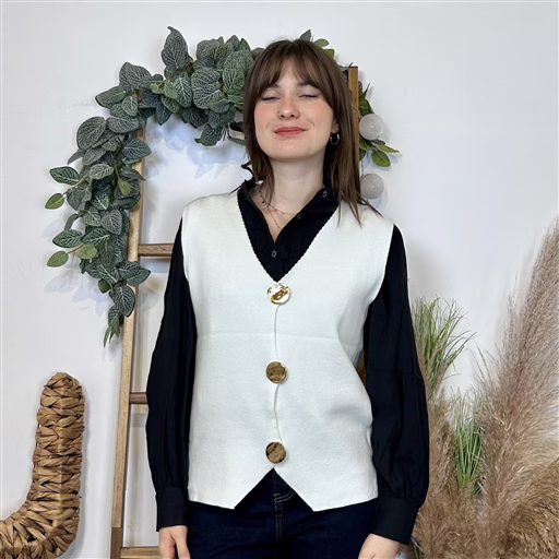 Ce gilet sans manches à boutons est la petite pièce chic et facile à adopter pour twister vos looks de saison. Avec sa maille douce et sa coupe droite légèrement ajustée, il structure la silhouette tout en restant confortable. Son encolure en V met joliment le buste en valeur et permet de le superposer facilement sur une chemise, une blouse ou un col roulé.