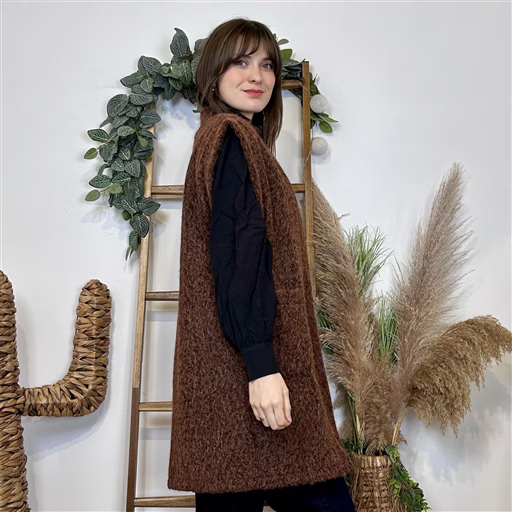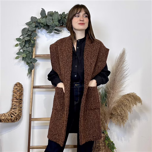 J953 – Gilet long sans manches en laine (TU) (marron)