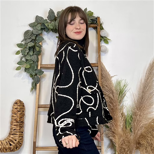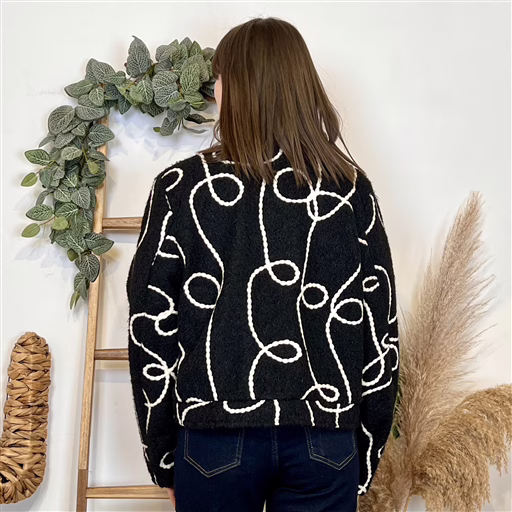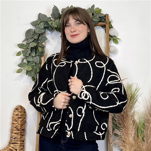 Veste boutonnée en maille douce et légèrement texturée, agréable à porter au quotidien. Son motif de lignes contrastées apporte une touche graphique moderne, tout en restant facile à associer. La coupe est confortable, un peu ample, avec des manches longues pour un joli tombé. Les boutons dorés viennent illuminer la pièce et renforcent son côté chic.