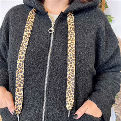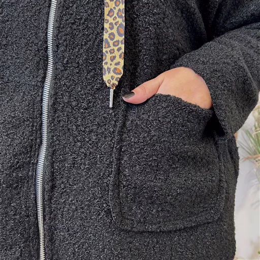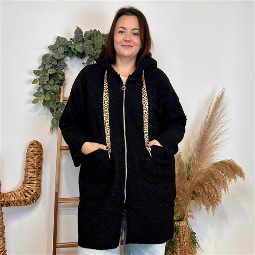 Manteau bouclette à capuche ultra cosy, revisité avec une touche tendance grâce à ses cordons imprimé panthère. Sa matière bouclette, douce et épaisse, apporte chaleur et confort dès les premiers froids, tout en donnant un look cocooning très stylé.