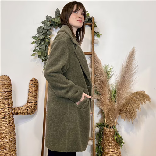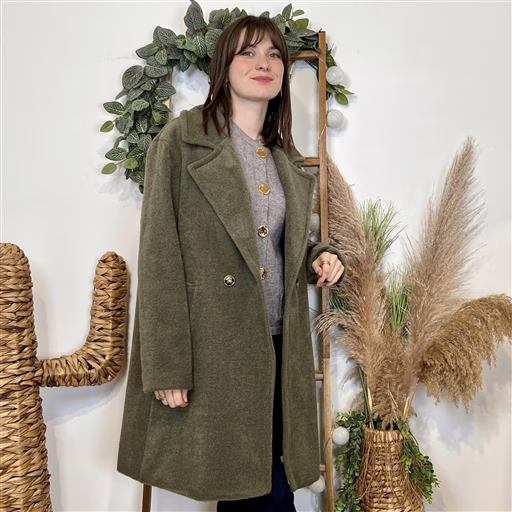 Manteau mi-long, proposé en taille unique. Confectionné dans une matière douce et chaude au fini légèrement bouclette, il est parfait pour l’hiver. Sa coupe droite ample enveloppe la silhouette avec confort, tandis que le col tailleur apporte une touche élégante. Fermeture croisée par boutons, poches latérales pratiques et longueur au-dessus du genou pour un look chic et facile à porter au quotidien.
