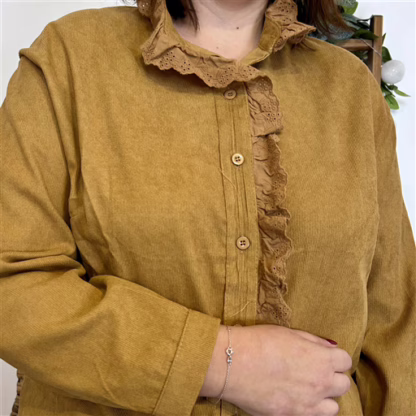 Chemise aspect suédine, idéale pour une allure chic et confortable. Le volant en dentelle qui longe la patte de boutonnage et le col apporte une touche féminine.