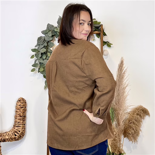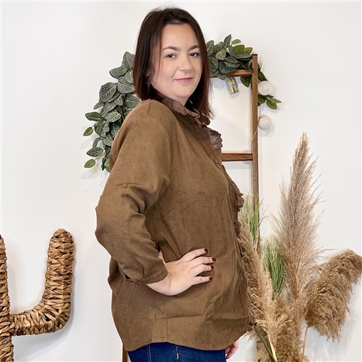 Chemise aspect suédine, idéale pour une allure chic et confortable. Le volant en dentelle qui longe la patte de boutonnage et le col apporte une touche féminine.
