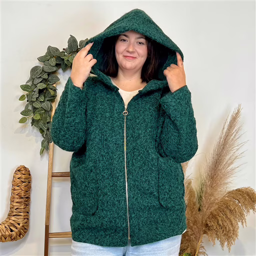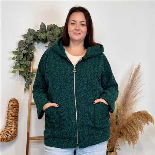 Manteau à capuche zippé, parfait pour rester bien au chaud avec une touche casual chic. On aime sa matière effet laine bouclée, douce et texturée, qui donne tout de suite un look cocooning. Son coloris bleu marine profond est facile à associer et apporte une allure élégante au quotidien.