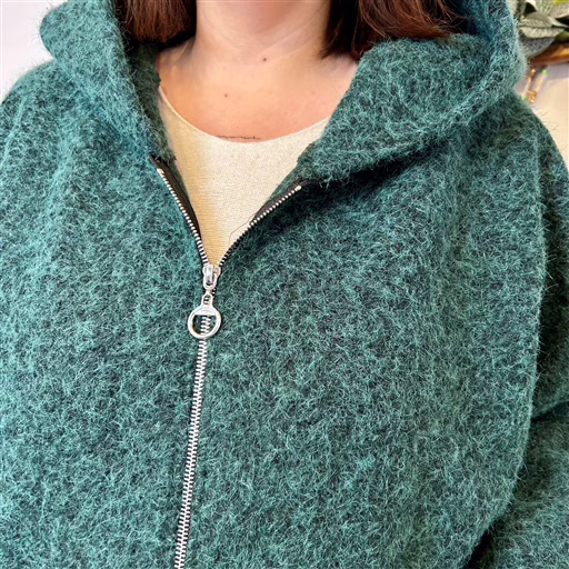 La coupe ample et confortable enveloppe la silhouette sans la marquer, idéale pour superposer un pull ou un gilet dessous. La capuche généreuse protège du froid et du vent, tandis que la fermeture éclair sur toute la longueur, avec curseur anneau, ajoute une note moderne et pratique.