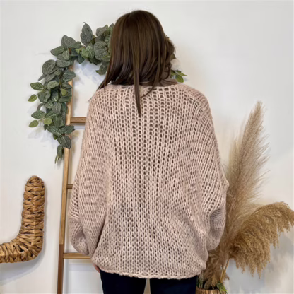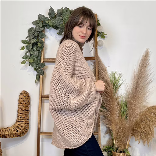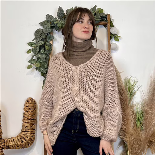 Craquez pour ce pull en grosses mailles au charme doux et cosy. Tricoté dans un fil moelleux effet mohair, il offre une maille aérée et légèrement ajourée qui apporte de la légèreté au look tout en gardant une belle sensation de chaleur. Sa coupe oversize et fluide tombe naturellement sur le corps : épaules légèrement tombantes, volume confortable et esprit cocooning assuré. Le col V féminin allonge la silhouette et met joliment le décolleté en valeur. Les manches longues ballon se resserrent aux poignets pour un porté blousant très tendance. On adore aussi sa base asymétrique, un peu plus longue au dos, qui donne du mouvement et permet de le porter loose sur un jean ou rentré partiellement à l’avant.