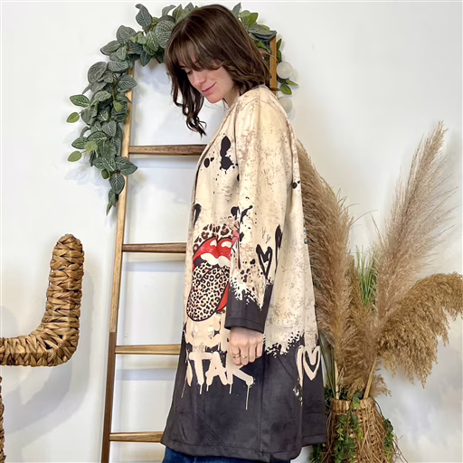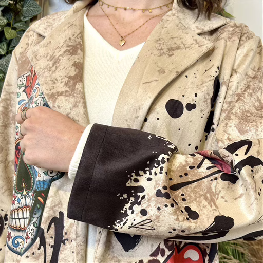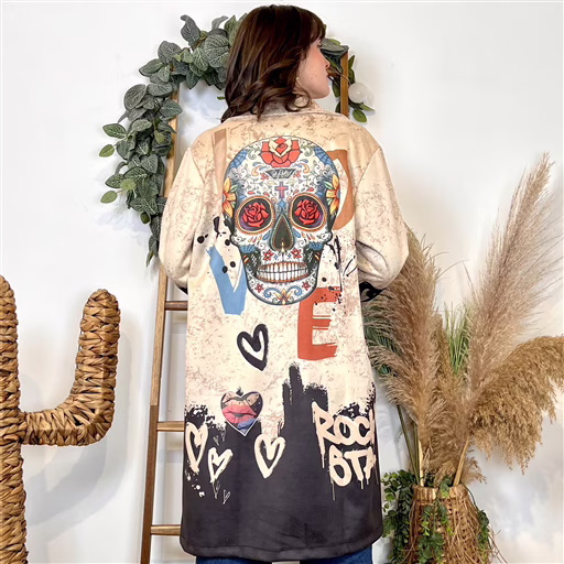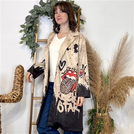 Imprimé : Motifs graphiques et colorés à l’avant et à l’arrière – bouche léopard, cœur, crâne floral et inscriptions Rock Star et Love
