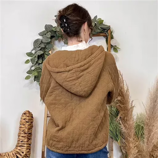 Vous avez rendez-vous avec la tendance ! Le cocoon et la douceur de cette veste matelassée 100% coton va vous séduire. Peut se resserrer en bas via des liens coulissants à nouer. Coupe oversize et 2 poches plaquées pour cette veste.