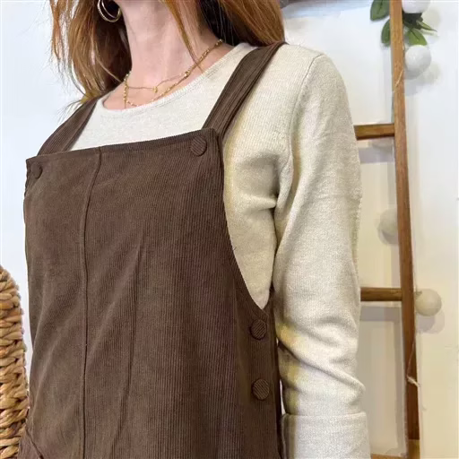 Robe unie haut salopette au col droit. Coupe doite, tissus velours et 2 poches plaquées. ASTUCE: un bouton supplémentaire au niveau de la bretelle vous permettra de gagner de la longueur. Facile à porter par temps plus frais avec nos collants magiques.
