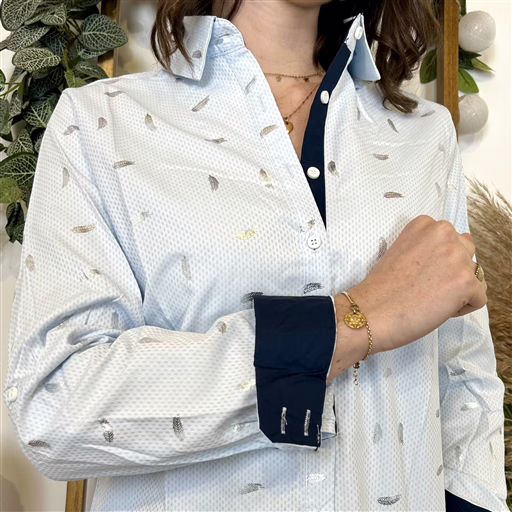 K093- Chemise « Plumes » revers (T36-T38) (bleu ciel)