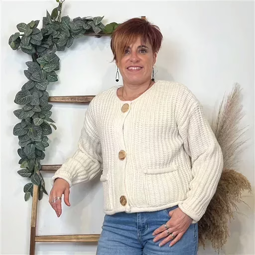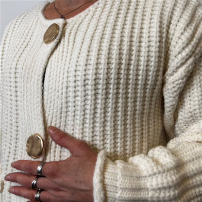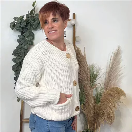 Ce gilet manches longues à grosses mailles et 3 gros boutons dorés est effectivement un incontournable de la saison – Modèle ayant une longueur se portant au dessus de la ceinture! Sa fabrication lui confère une élégance particulière. Il se marie parfaitement avec une blouse ou un chemisier, ajoutant une touche chic à n’importe quelle tenue.