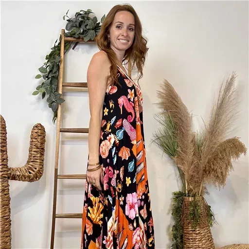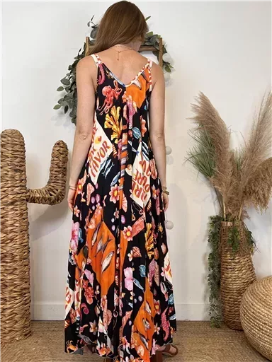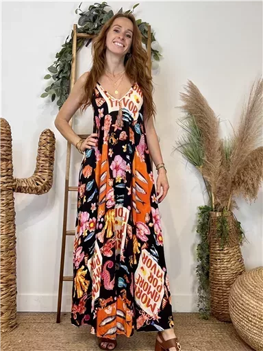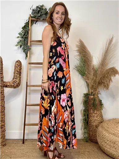 Robe proposée en Taile unique. Coupe trapèze maxi, tissé, col surpiqué.