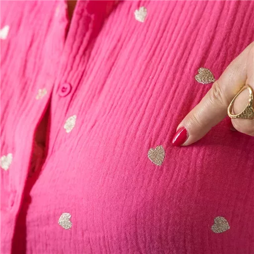 Chemise manches courtes à l’imprimé ❤️‍🔥. Col chemisier, fond uni, petits coeurs en fil doré contrasté. Imprimé printannier la chemise peut se porter nouée ouverte ou boutonnée. Ce modèle est ici porté avec un pantalon fluide à 14.90€.