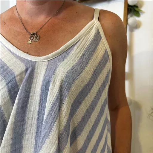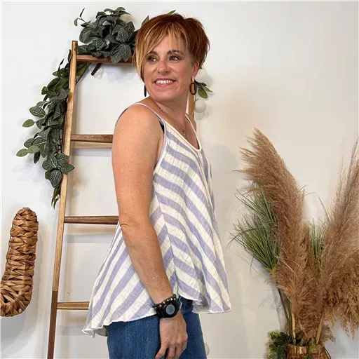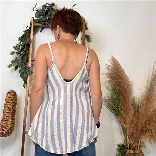 Ce débardeur romantique et bohême avec ses fines bretellesse distingue par sa coupe évasée et son imprimé rayé, créant une silhouette fluide et aérienne. Il incarne l’esprit « Vacances » avec une touche de romantisme, parfait pour celles qui recherchent un style féminin et confortable. Ici porté avec unJean Voggo à 18.90€.