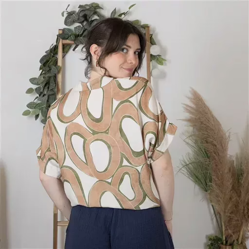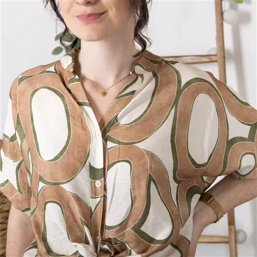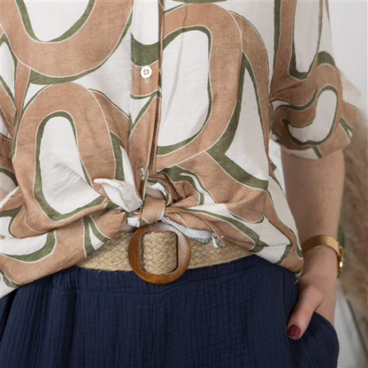 Chemise manches courtes à l’imprimé Seventies. Col en V. Imprimé lumineux. La chemise est boutonnée de haut en bas. Ici portée avec un jean Voggo à 18.90€.