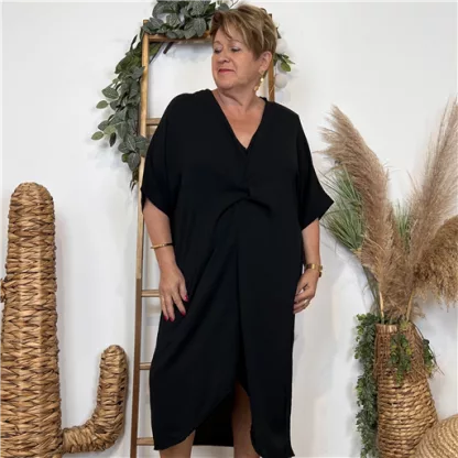 Robe casual ample à manches courtes, col V avec un noeud de pliage sur le devant, couleur unie. Robe loose à manches courtes grande taille pour femmes.