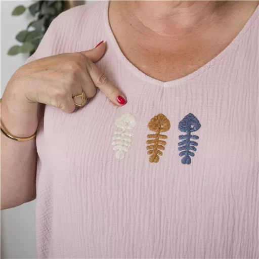 Tunique manches courtes unie avec 3 broderies « Sardines » sur le devant. Léger Col en V. Coupe estivale et légèreté absolue avec sa composition en coton. De fabrication italienne, ce modèle est ici porté avec un pantalon fluide de nos collections.