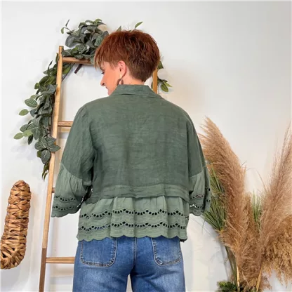 Entre la veste et le chemisier, ce modèle en coton aux manches 3/4, est vraiment une pièce tendance. Bas et manches volantées en broderie anglaise ! Il vous assurera qualité et style, tandis que les couleurs proposées permettent de l’associer facilement à votre garde-robe.. Portez-le sur un T-shirt ou une robe pour un look chic et décontracté. Un choix parfait pour ajouter une touche de douceur et de personnalité à vos tenues !