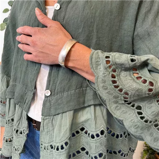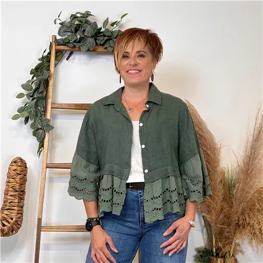 Entre la veste et le chemisier, ce modèle en coton aux manches 3/4, est vraiment une pièce tendance. Bas et manches volantées en broderie anglaise ! Il vous assurera qualité et style, tandis que les couleurs proposées permettent de l’associer facilement à votre garde-robe.. Portez-le sur un T-shirt ou une robe pour un look chic et décontracté. Un choix parfait pour ajouter une touche de douceur et de personnalité à vos tenues !