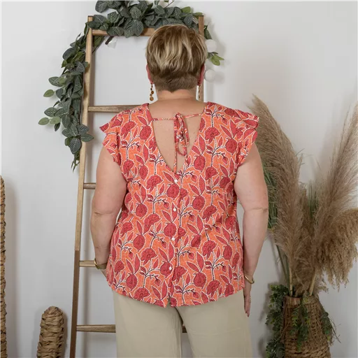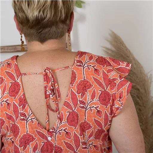 Encolure en V. Dos en V, boutonnage et petit lien au niveau du cou.