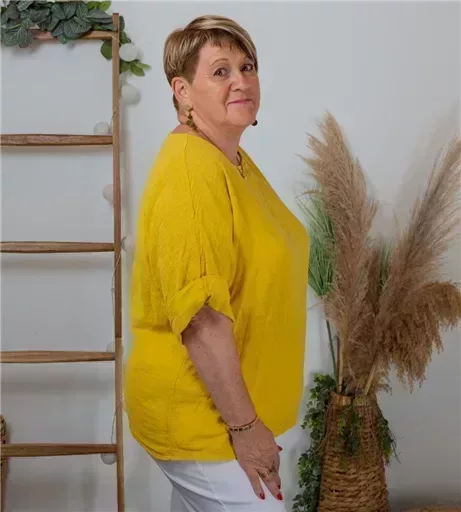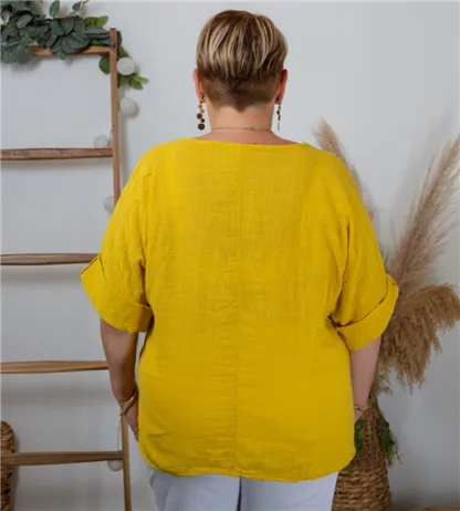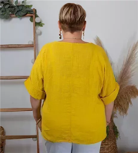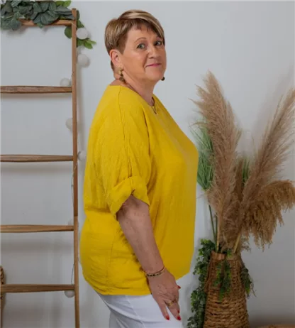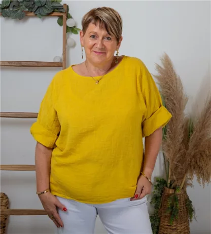 Tunique manches 3/4 unie. Léger Col rond. Coupe estivale et légèreté absolue avec sa composition en coton. De fabrication italienne, ce modèle est ici porté avec un jean Voggo à 18.90€.
