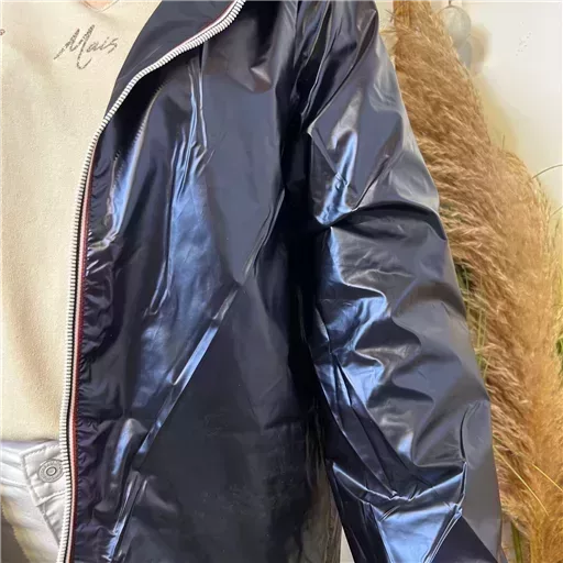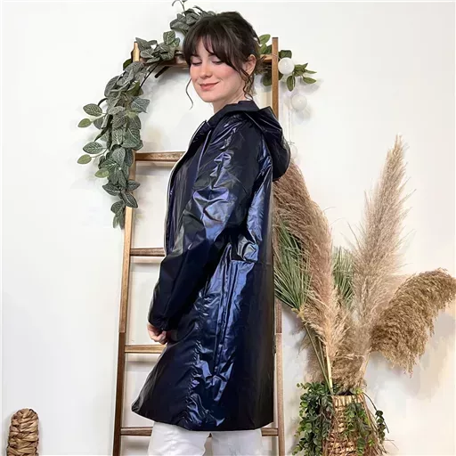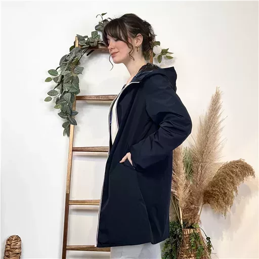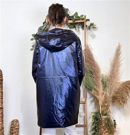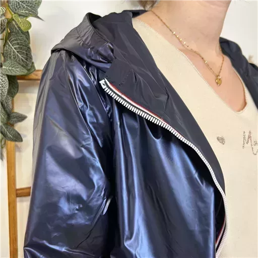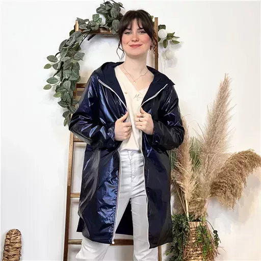 Imperméable réversible et léger mi-long. veste mi-longue, idéale pour les activités de plein air. Cet imperméable est doté d’une capuche de 2 poches zippées et d’une fermeture éclair avec un biais « Bleu, blanc, rouge ». Resserré au niveau des poignets. Différents liens d’ajustage. Une expérience fantastique avec un coté pratique et un coté uni brillant très fashion. Ce qui en fait un excellent choix pour celles qui recherchent une veste de pluie à la fois légère, pratique et fantaisie.