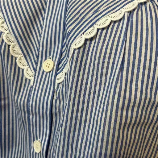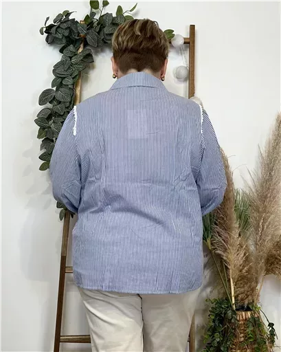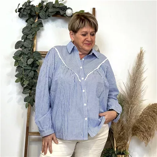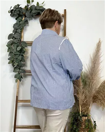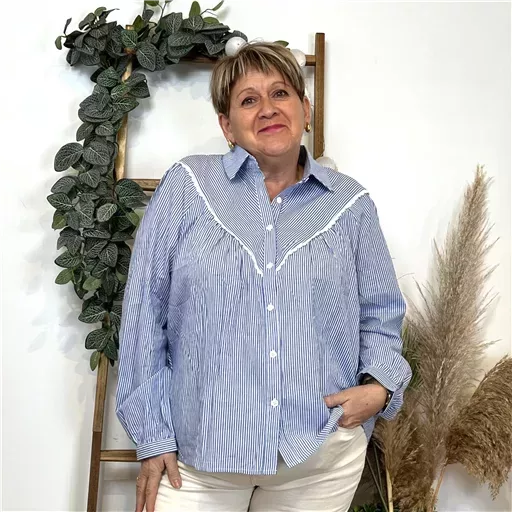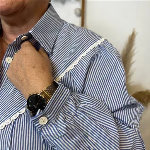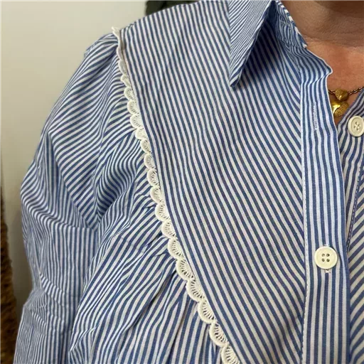 Cette blouse rayée en coton se distingue par sa délicate broderie contrastée en V sur le devant et au niveau des épaules. Les manches longues offrent une élégance intemporelle, tandis que le col en V met en valeur le décolleté avec une touche de sophistication. Les broderies fantaisie ornant le tissus offre une note unique et raffinée à la pièce. Confortable et chic, et 100% coton, elle est tout simplement parfaite.