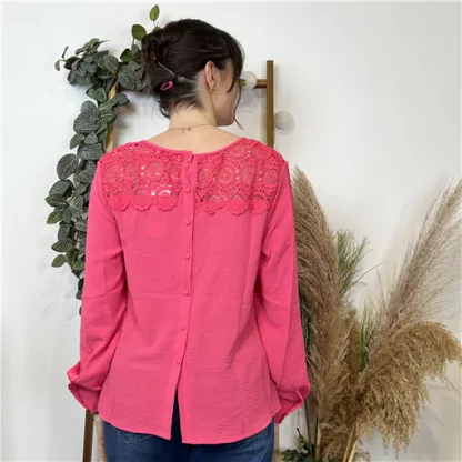 Blouse unie avec des finitions soignées proposée par la marque « Version Féminin ». Boutonnage de haut en bas au niveau du dos, col en V et haut du buste en dentelle. Manches longues et finition poignets. Tout en transparence avec ses broderies. Ce modèle de blouse est le chouchou de la saison ! Cette blouse est ici portée sur jean Voggo à 24.90€.