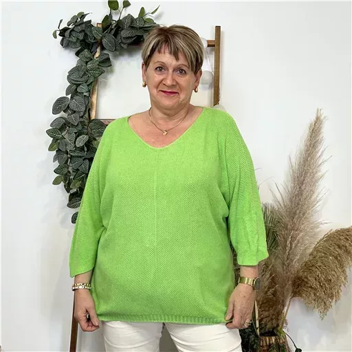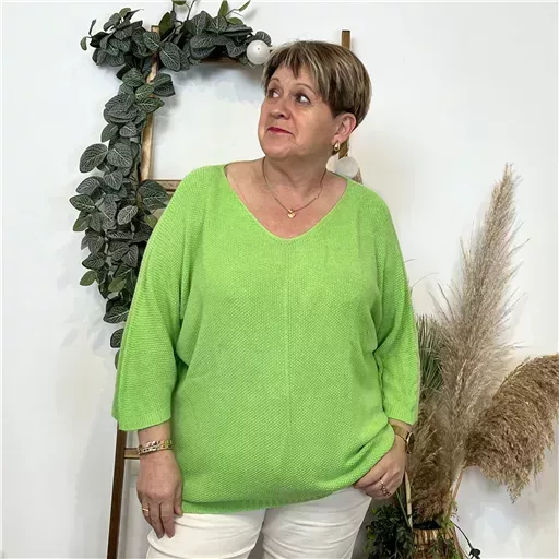 Modèle aux manches 3/4 col V avec un liseret devant, idéal pour le début de saison. Facile à porter sur un jean taille Haute Voggo et une gilet. De fabrication italienne, ce modèle est proposé en taille unique. Il conviendra du 42 au 50 en fonction des morphologies. Maille nid d abeille.