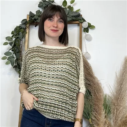 Ce pull crop top en maille avec un col bateau et des manches courtes arrivant aux coudes.