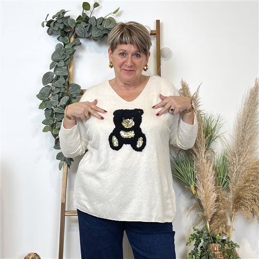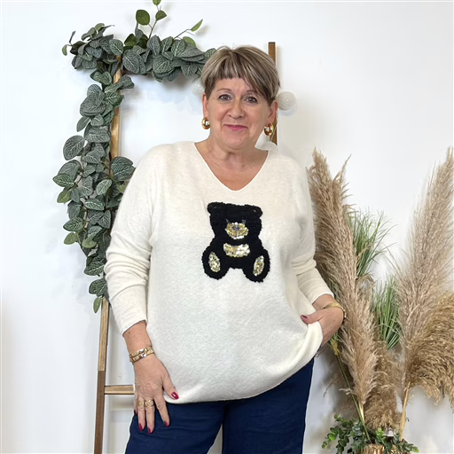 Ce Pull fond uni de fabrication italienne pour femme est proposé avec son patch Ourson sur le devant. Proposé en taille unique il conviendra du 42 au 48 en fonction des différentes morphologies. Ce pull coupe droite est confectionné en maille un tissu doux et chaud sans être trop épais rendant ce dernier idéal pour les saisons fraîches. Il présente un col V, et des finitions cousues. Le Must Have de cette année 2025.