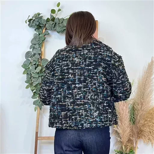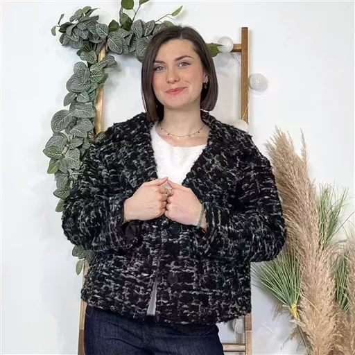 Veste courte non doublée imprimée chiné. 2 Boutons, un col et deux poches sur les cotés. Manches longues, ce modèle sera facile à porter sur une blouse ou un pull leger. ⚠️ modèle contenant de la laine.