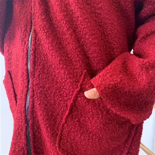 Vous ne le quitterez plus. Il est léger et il tient chaud ! Ce manteau a une fermeture éclair et une capuche, en maille bouclette et possède deux poches. De fabrication italienne, ce manteau aux manches chauves souris. Manches chauve-souris. ce modèle sera vraiment élégant avec sur un jean Voggo et un pull Tricotonic.